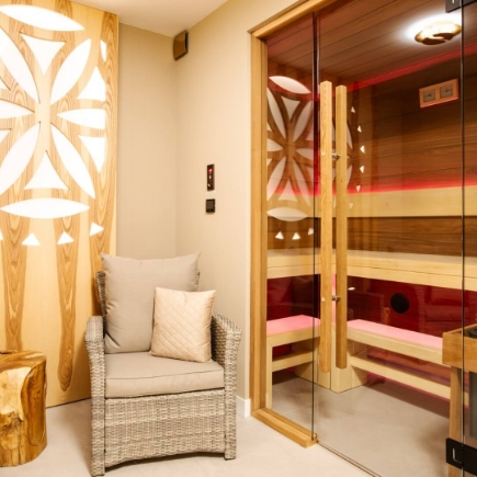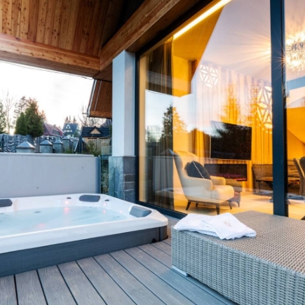 Na tarasie czeka prywatne jacuzzi i wygodne meble ogrodowe. Jest to doskonałe miejsce na poranną kawę z widokiem na góry lub romantyczny wieczór pod gwiazdami. W strefie wellness odprężysz się w saunie i na komfortowych fotelach, a dla pełnej wygody wille wyposażono w klimatyzację, szybkie Wi‑Fi i telewizję cyfrową.